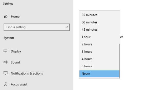 Após acessar a opção Power & sleep settings, você vai configurar o tempo colocando em "never", como mostra na imagem abaixo: