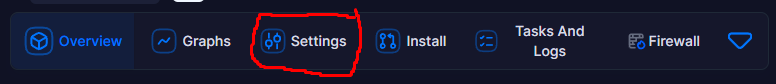 1º = Na parte inferior da sua vps selecionada na Área do Cliente, procure na janela do Virtualizor por SETTINGS: